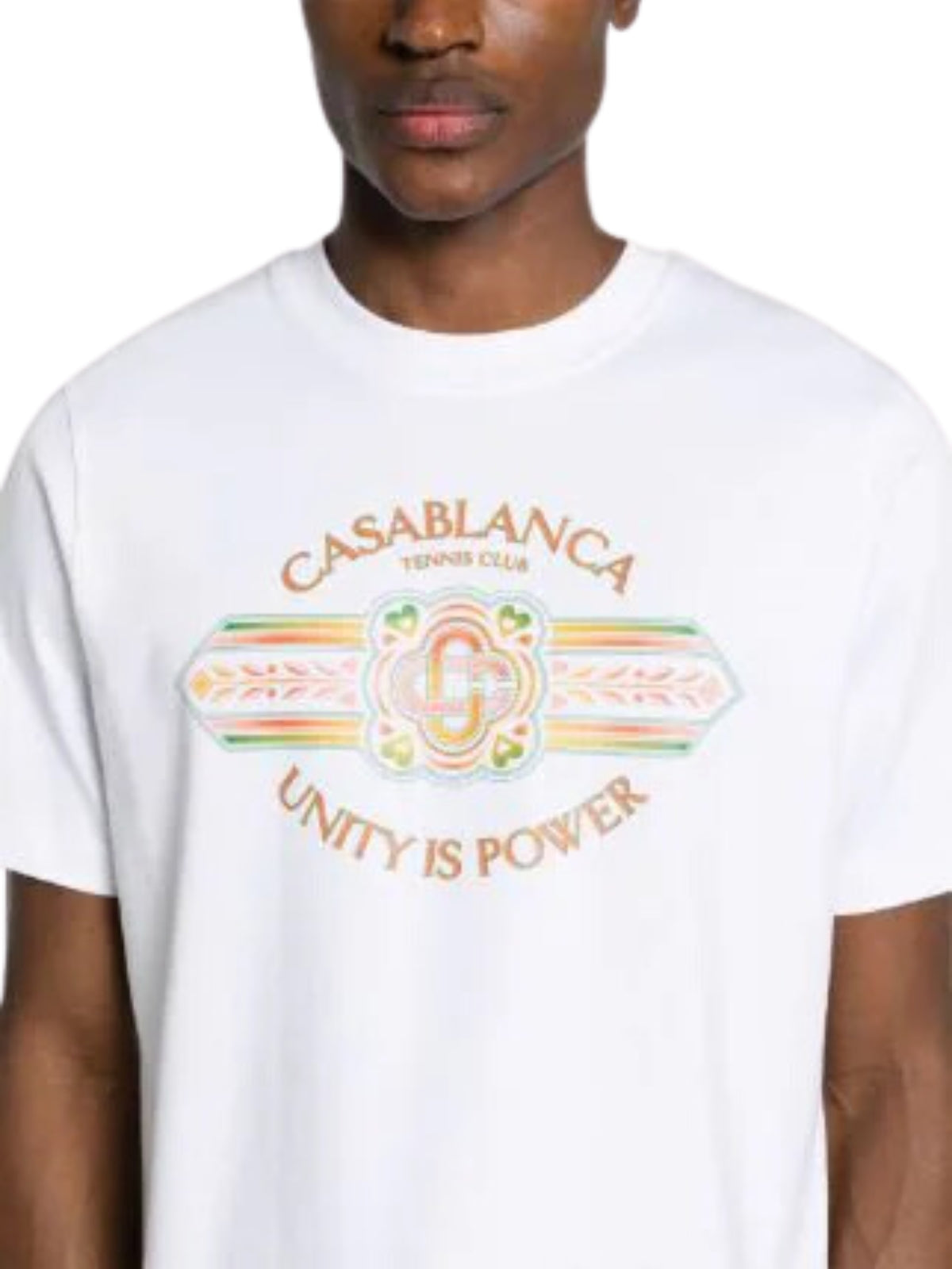 Show your support for unity and power with the Casablanca T-Shirt. Made with high-quality materials, this white shirt features the iconic Casablanca logo and the powerful message "Unity Is Power". Let your fashion make a statement and inspire others to come together.