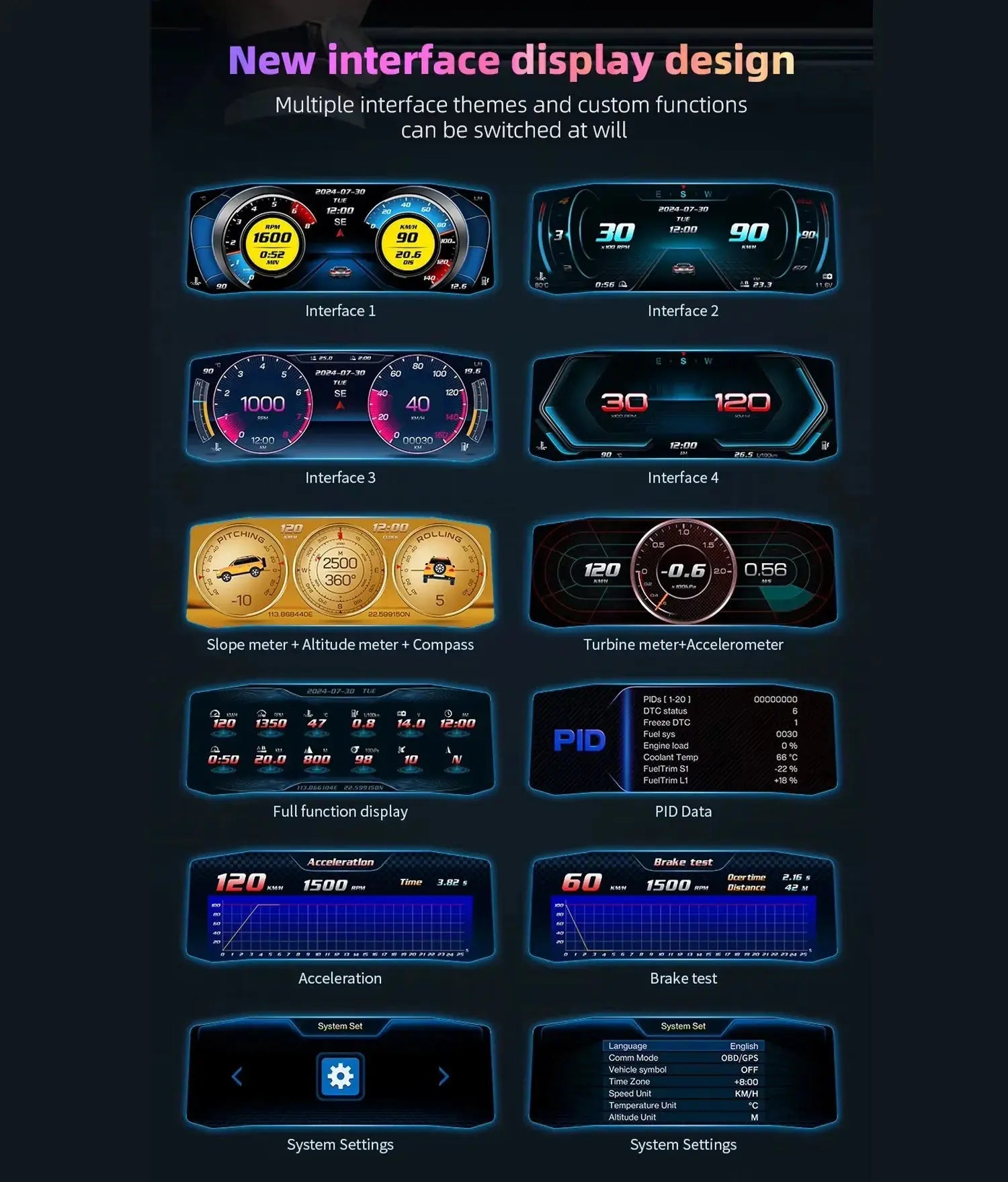 Elevate your driving experience with the all-new P4 Car OBD Instrument Display. This innovative digital dashboard integrates a comprehensive suite of vital vehicle data and advanced metrics into one sleek, vibrant unit. Designed for modern drivers, it goes beyond traditional gauges, offering real-time performance insights, GPS assistance, and even an immersive colorful atmosphere light to personalise your car's interior. Get accurate readings for speed, RPM, fuel, and more, alongside specialized functions like turbine metering, slope inclination, and acceleration analysis. Easy to install via your vehicle's OBD2 port, the P4 display is a must-have upgrade for enhanced safety, performance monitoring, and driving enjoyment.