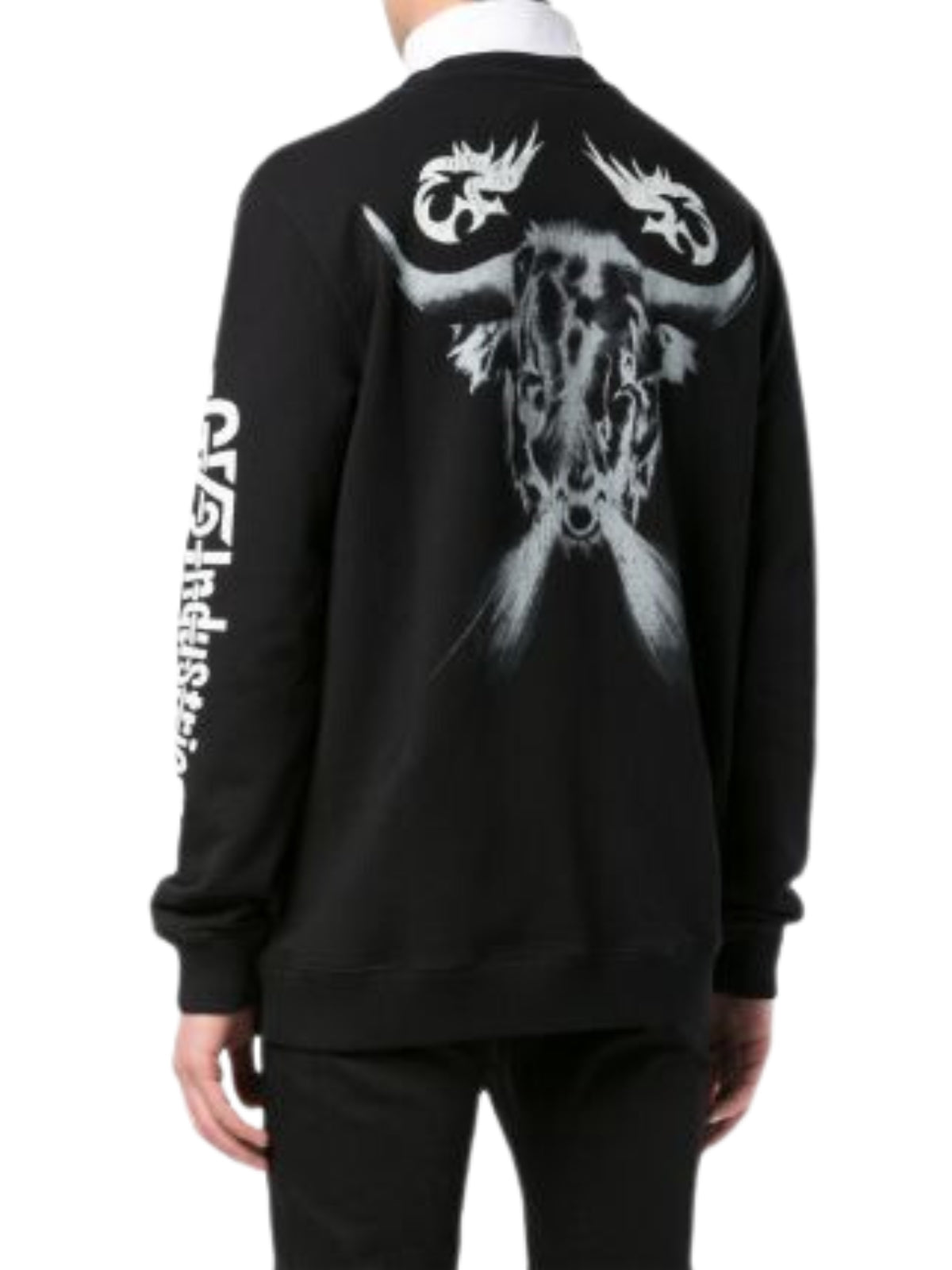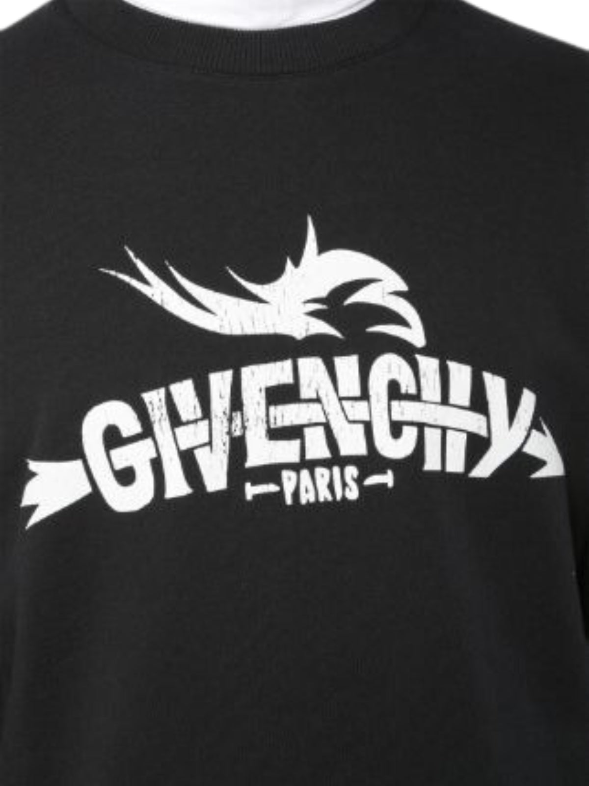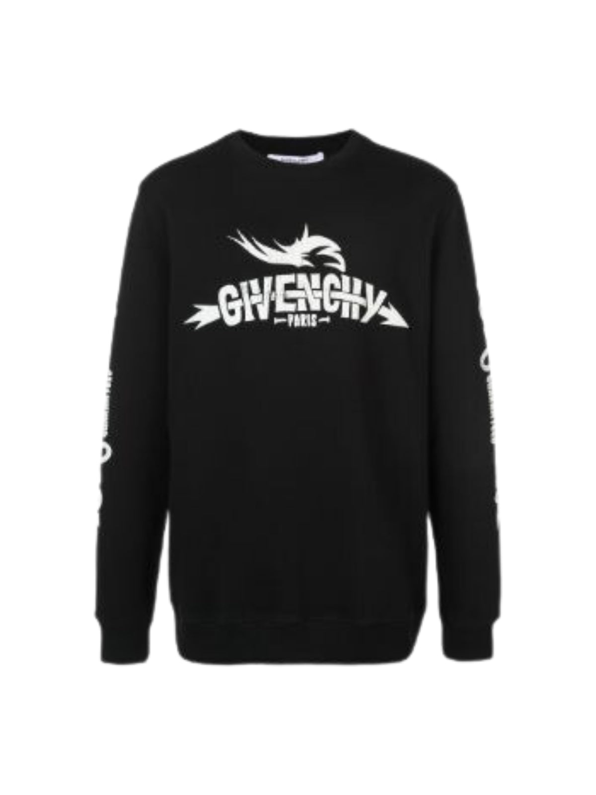 This Givenchy sweater features a striking black graphic design. Made from high-quality materials, it offers both style and comfort. The perfect addition to any wardrobe, this sweater is sure to elevate any outfit. Add a touch of designer luxury to your wardrobe with this iconic Givenchy piece.
