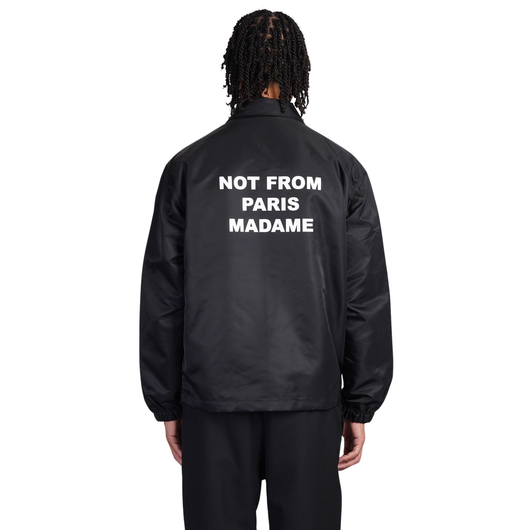 Introducing the Drole De Monsieur Jacket in sleek black, featuring the brand's iconic slogan. Stay warm and stylish with this must-have piece. Elevate your fashion game with this unique statement jacket. Limited quantities available, get yours now!