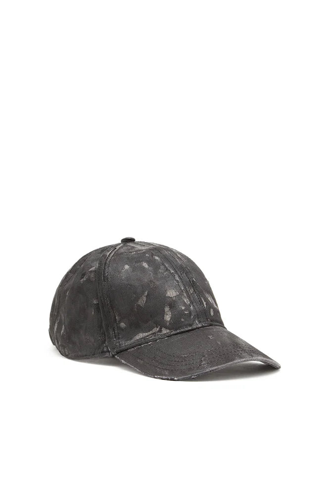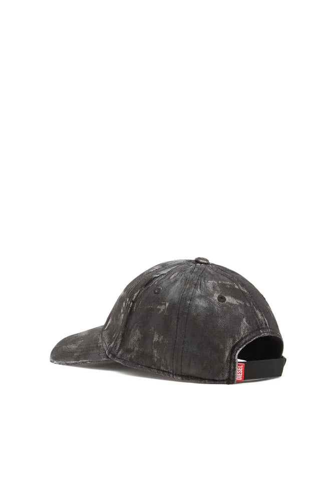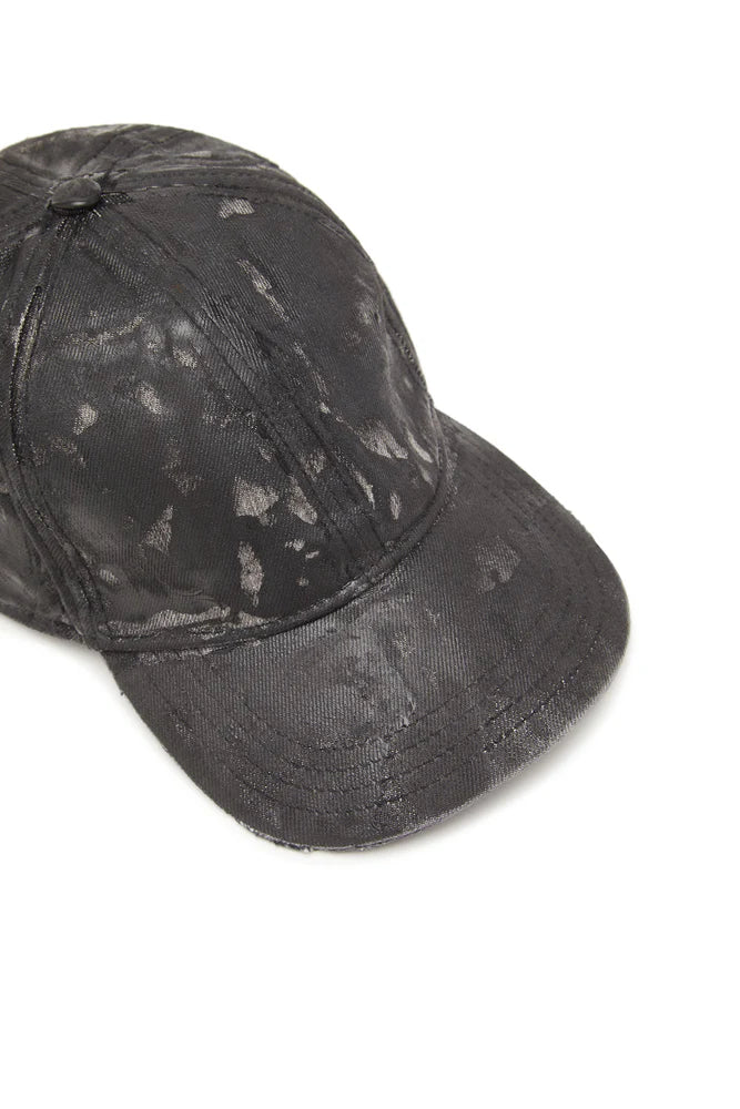 As seen on the FALL WINTER 2024 RUNWAY, this men's baseball cap is built from black denim. A coated finish and subtle distressing along the edges update the look, celebrating Diesel's signature lived-in looks and experimental attitude.