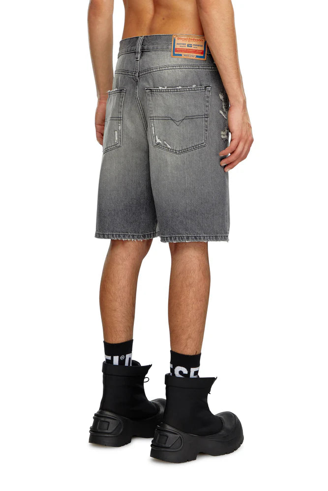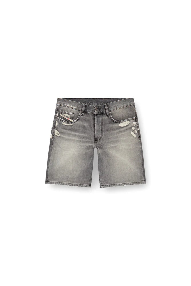 Men's five-pocket shorts with a regular waist and straight leg, cut to knee length. The style is crafted from grey fix denim that's part of Diesel's DNA selection of iconic washes, detailed with abrasions on the hems and bold ripped and repaired detailing.