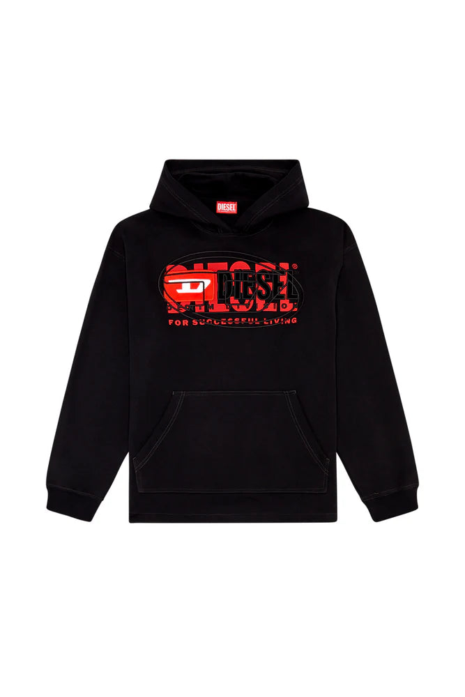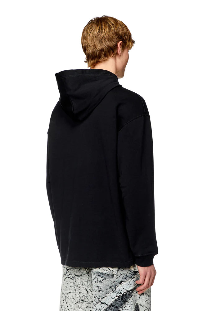 Men's relaxed-fit hoodie with side slits. Made from loopback cotton jersey, this style is emblazoned with a trio of For Successful Living, Denim Division and Oval D logos layered one upon another – each design is rendered using a different technique, such as print, appliqué and 3D embroidery.