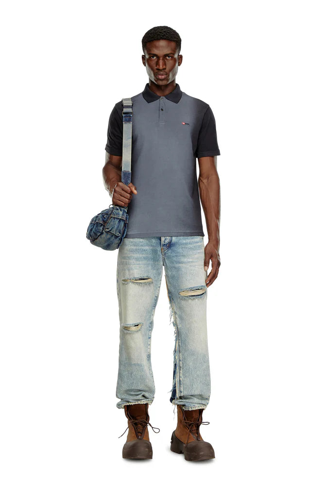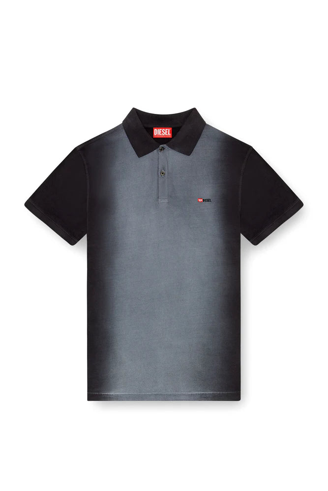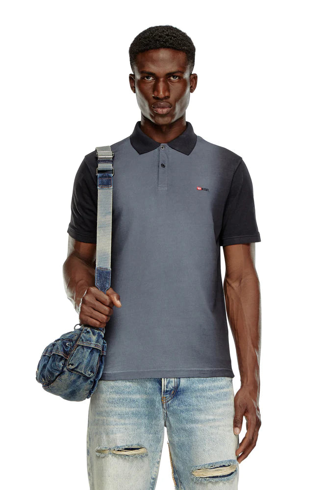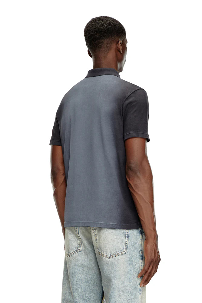 A slim-fitting style, this men's polo shirt is made from raw-look organic cotton jersey. Sprayed on the front and back for a faded, lived-in look, it's embellished with a micro-embroidered Diesel logo on the left chest.