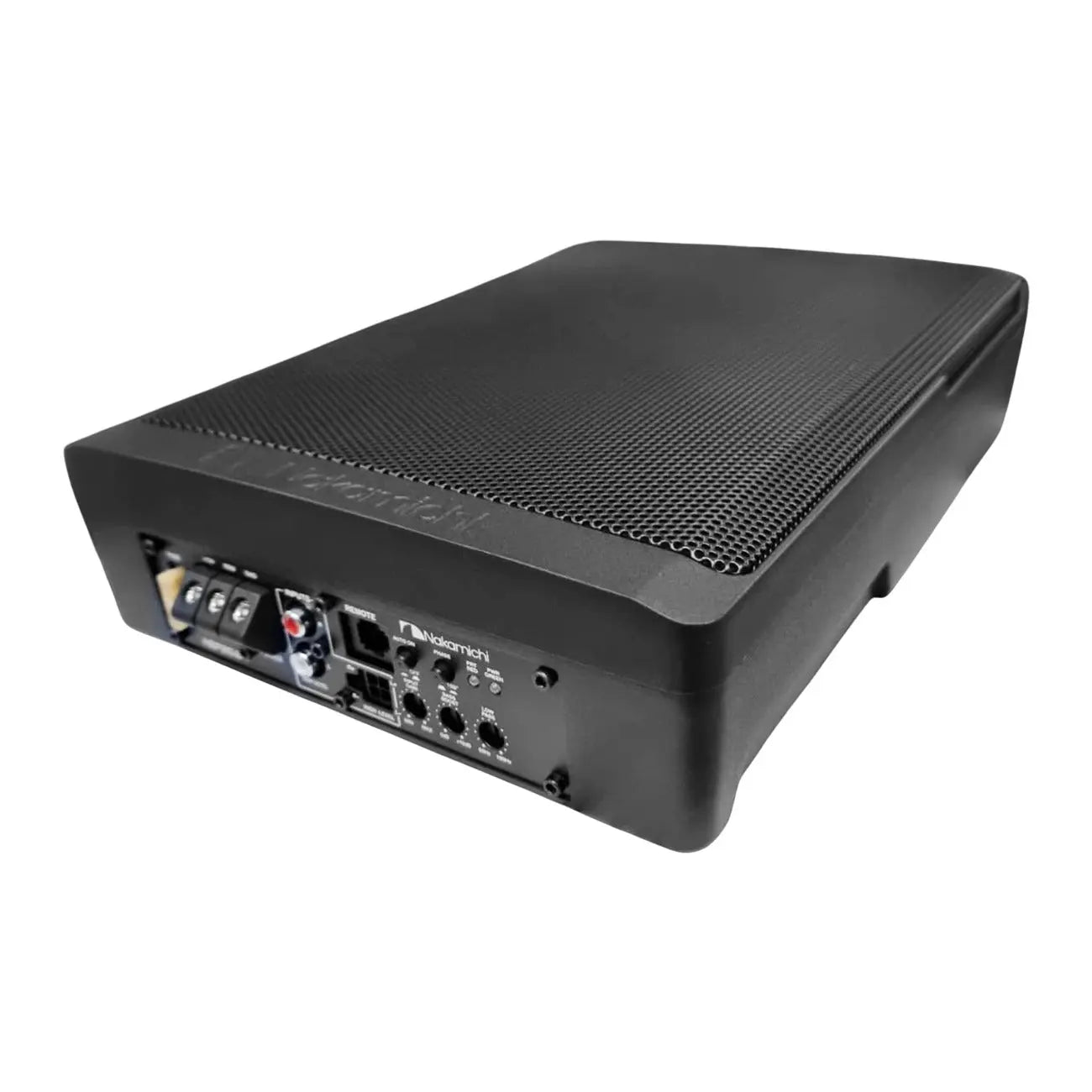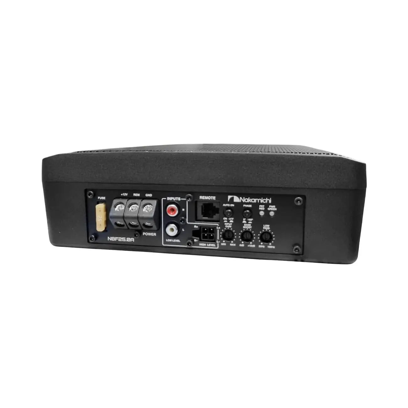 The Nakamichi NBF25.0A is a compact, active underseat subwoofer designed to enhance automotive audio systems. It features a 10-inch subwoofer driver with 150 watts of RMS power and a peak power of 1000 watts. Key specifications include a frequency response of 20Hz-180Hz and a distortion rate of less than 0.5%.