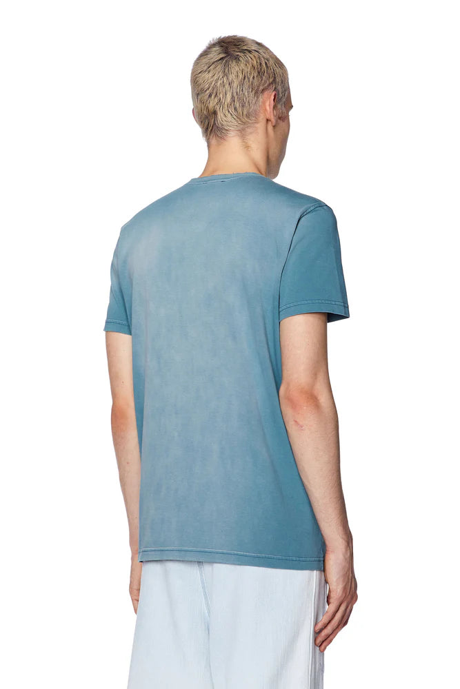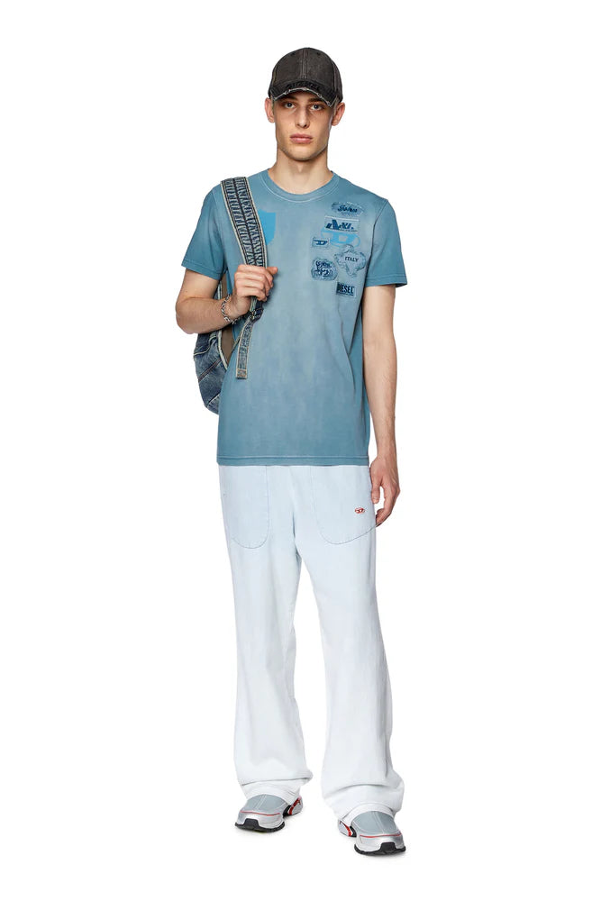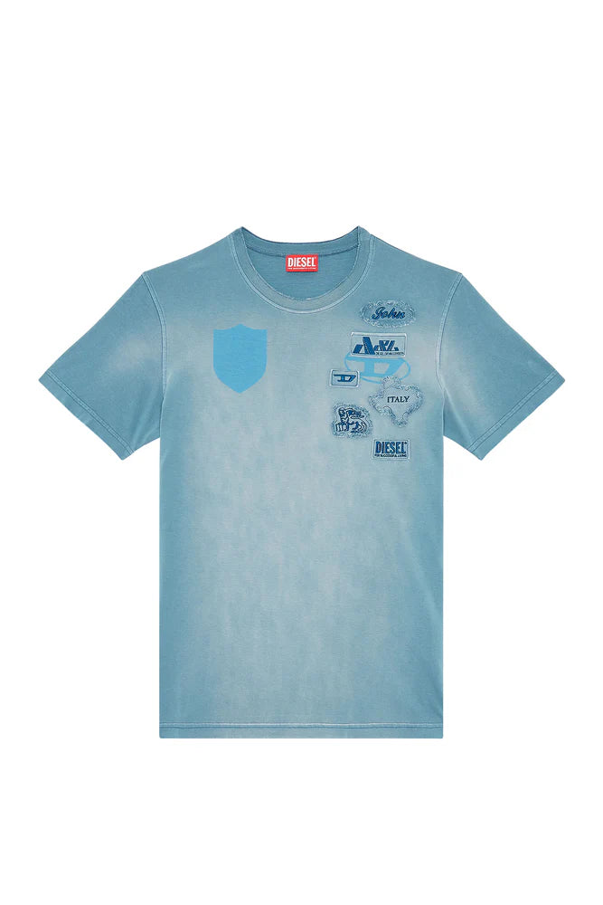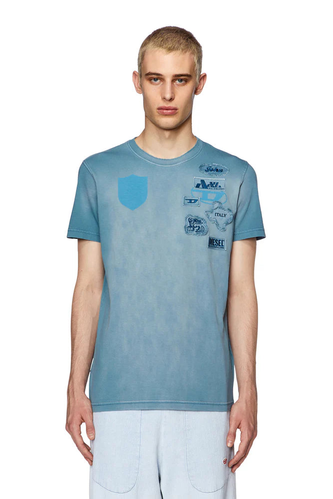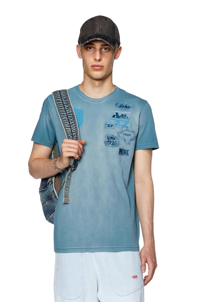 This men's slim-fit tee is cut from mid-weight cotton jersey, embellished with embroidered patches and prints on the chest. Garment-dyed and sprayed for a sun-faded look.