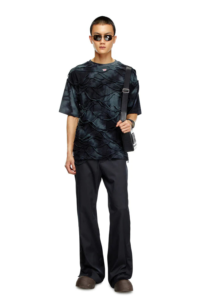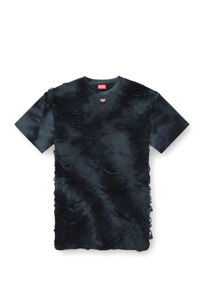This men's tee is made from green cotton jersey, treated with a tie-dye finish. The relaxed silhouette is layered with raw-cut strands that hang over the garment with a floating effect. Finished with a tiny embroidered D patch below the neckline.
